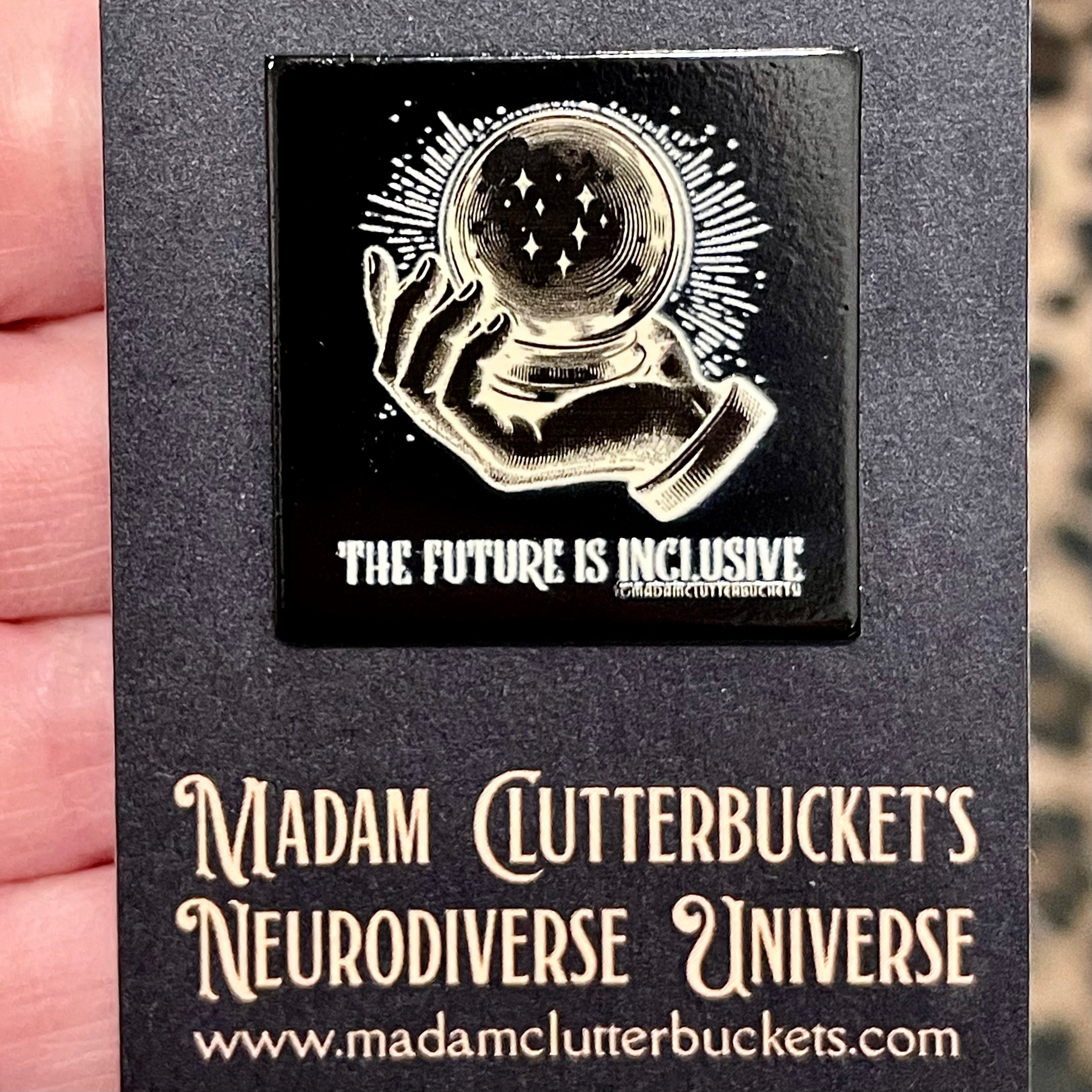 Madam Clutterbucket's own line of enamel pins that were made in collaboration with employees. These pins are well made and are perfect for showing your disability pride.
