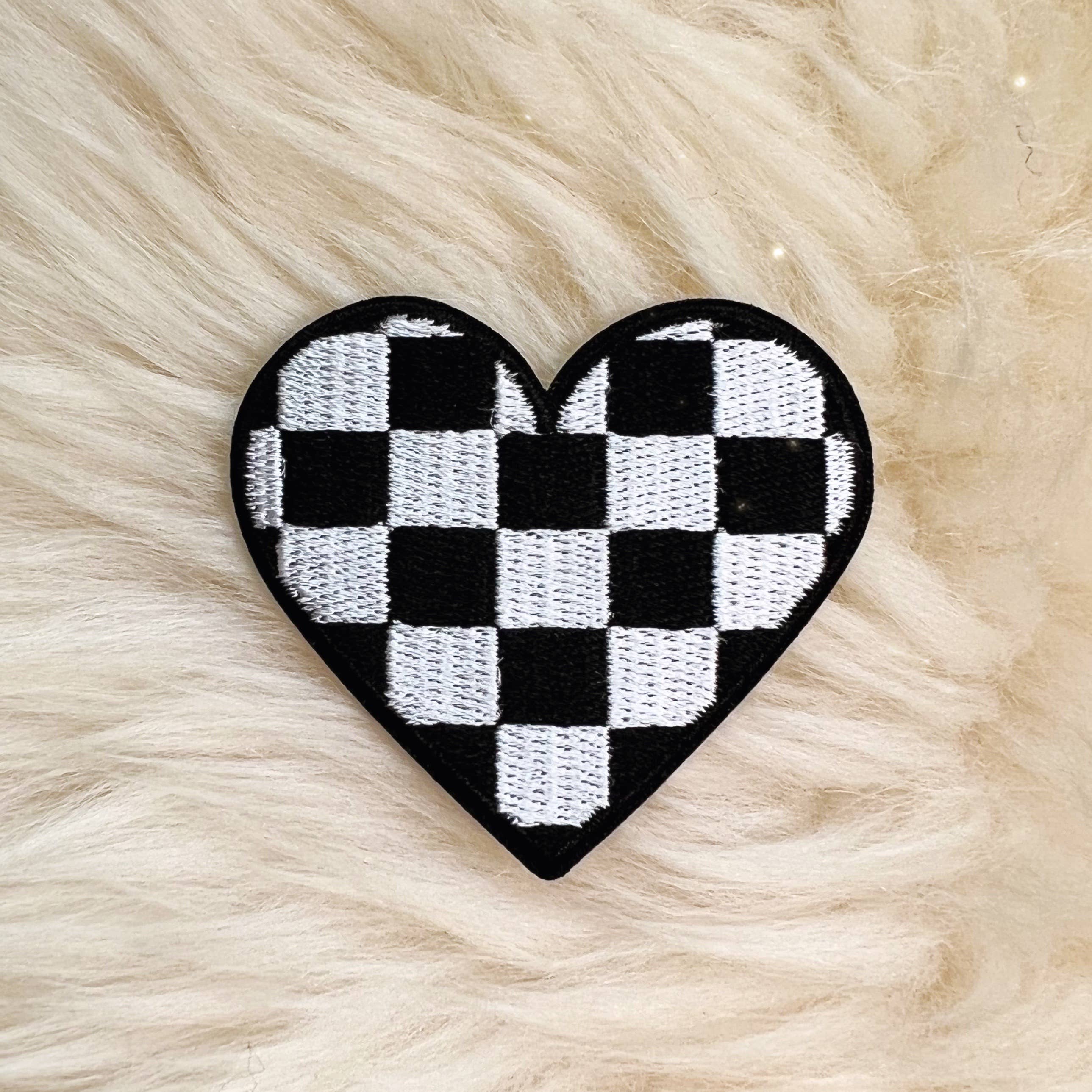 Add some vibes with a checkered heart patch! Available in your choice of classic black & white, pink on pink, or lilac & lime green checker print. Fun little gift for friends (or yourself!). Fully embroidered. Wildflower + Co. DIY.
