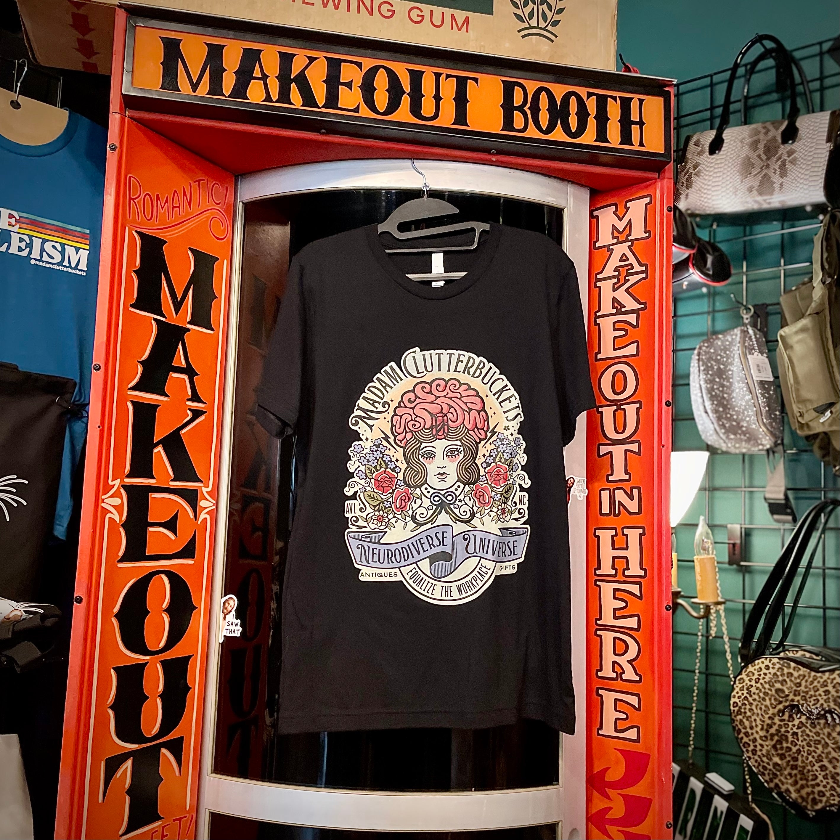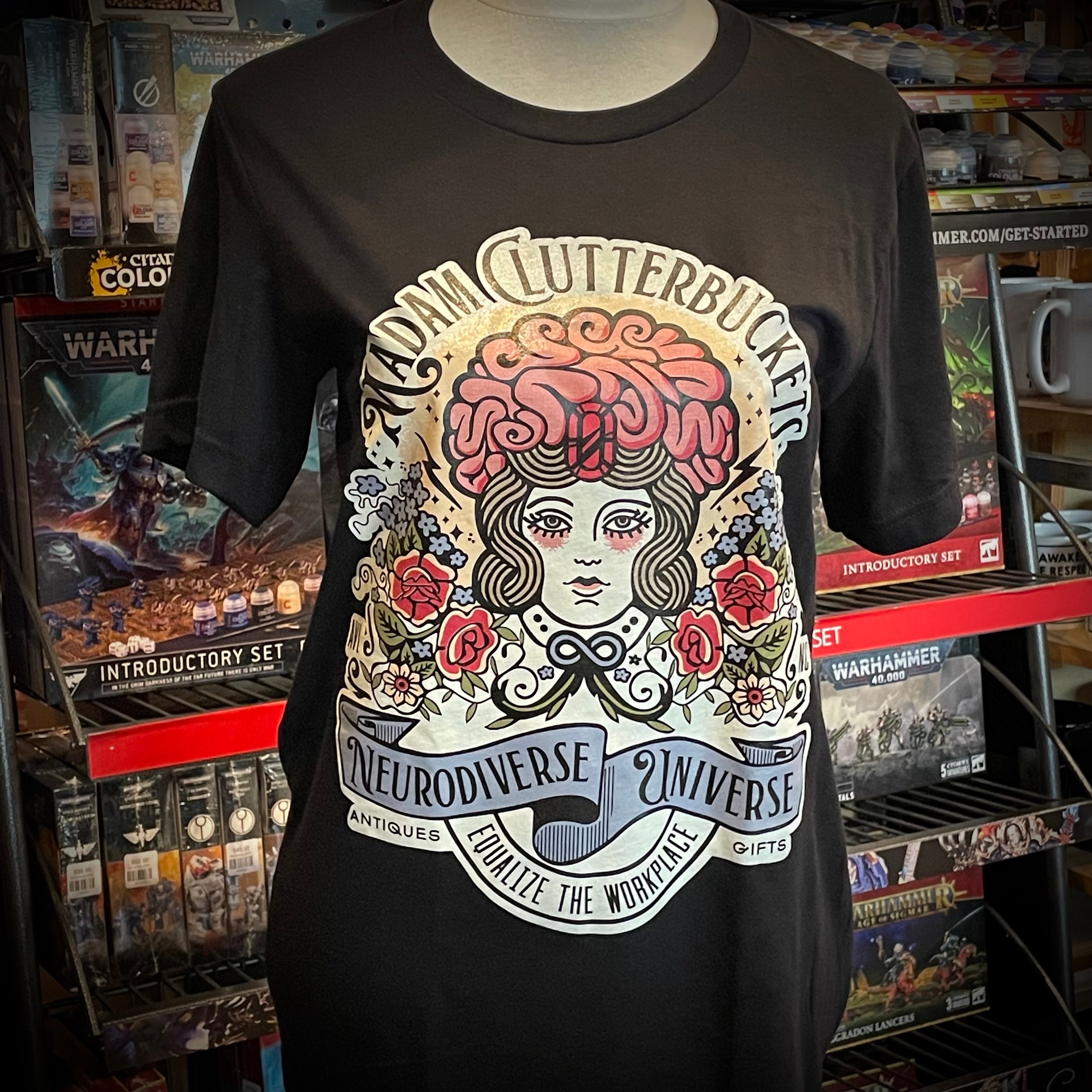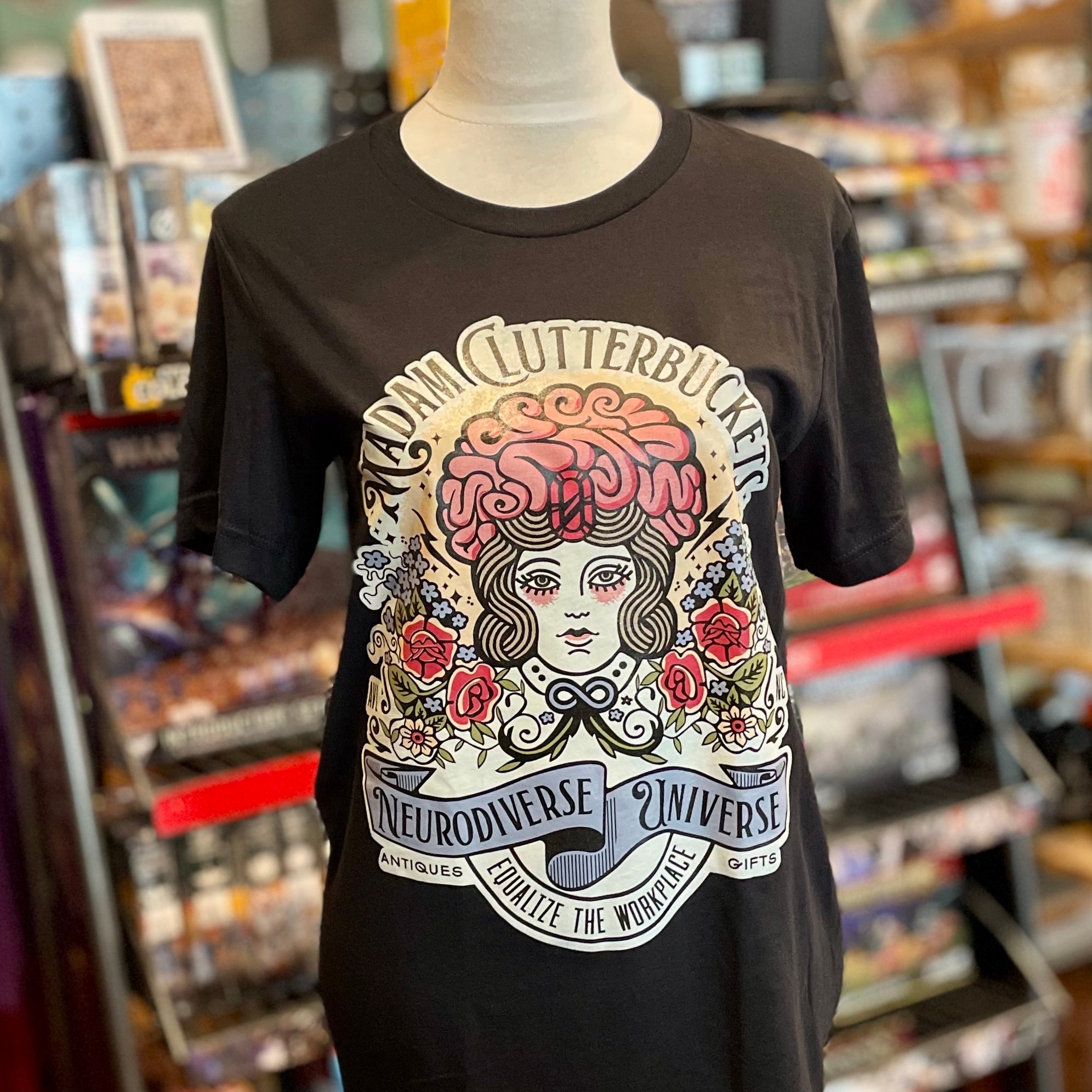 **Black short-sleeve t-shirt with the Clutterbucket's tattoo-style logo printed on front. A brunette woman wearing a brain hat surrounded by flowers and foliage, starbursts, lightning bolts and a powder blue banner with "NEURODIVERSE UNIVERSE" in black lettering. "Madam Clutterbuckets" above the woman's head. "EQUALIZE THE WORKPLACE" in black lettering below the banner.