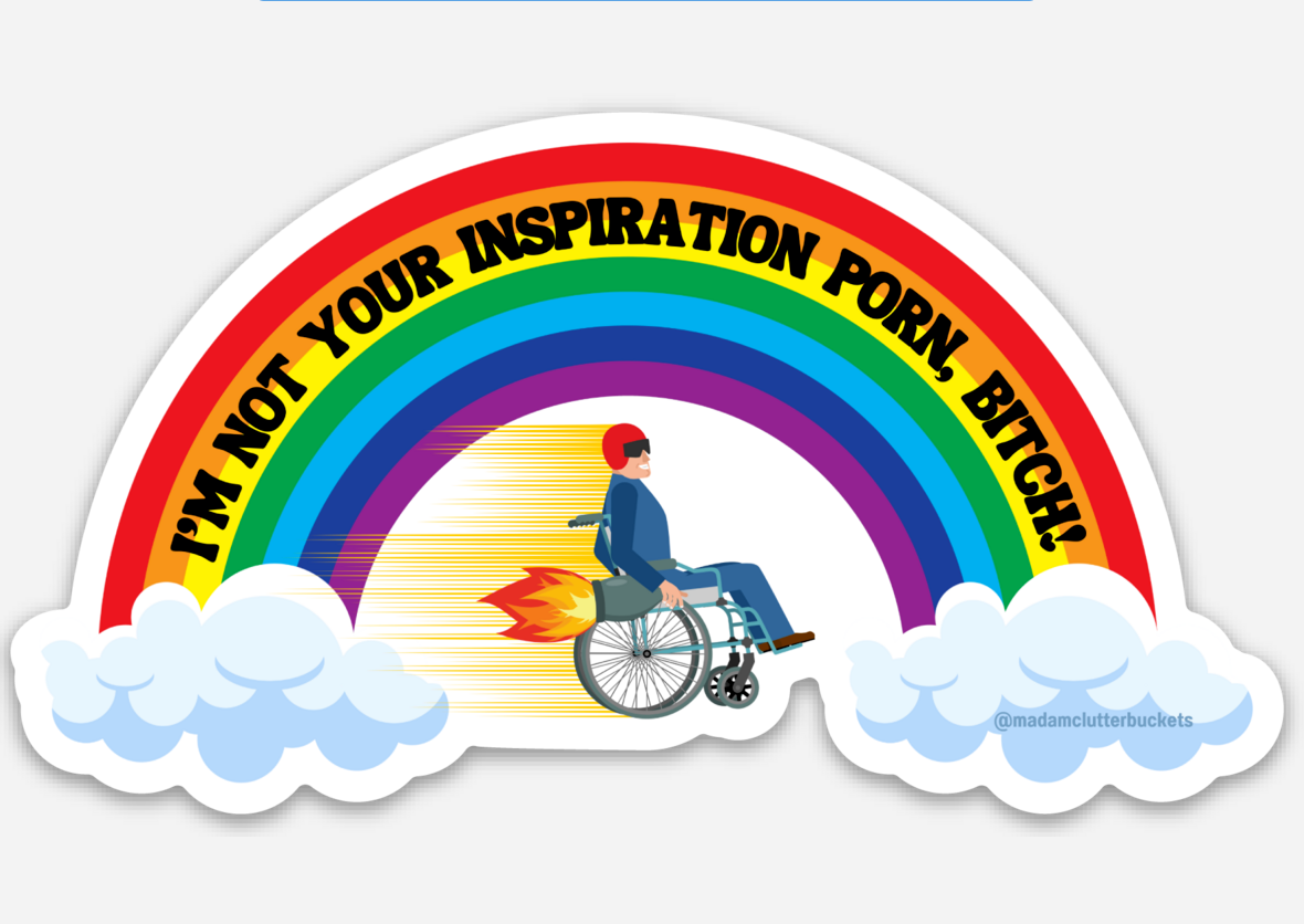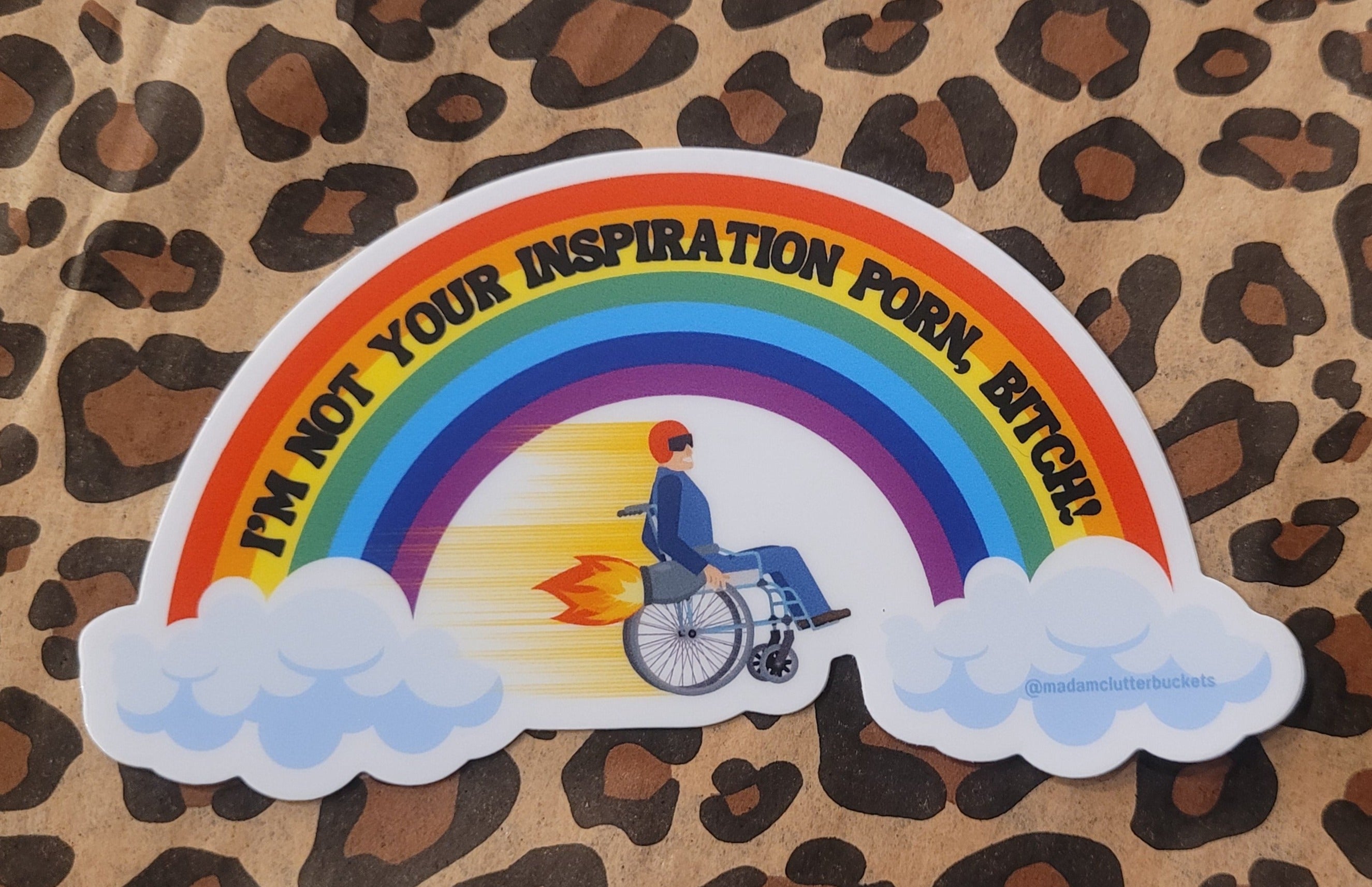 **A die cut sticker of a vibrant rainbow ending in fluffy clouds on both sides. Under the rainbow, a person in a wheelchair wearing a helmet. A motor on the wheelchair blows out fire, and yellow streaks behind the person in the chair indicate fast motion. Over the rainbow in black letters: "I'M NOT YOUR INSPIRATION PORN, BITCH!"