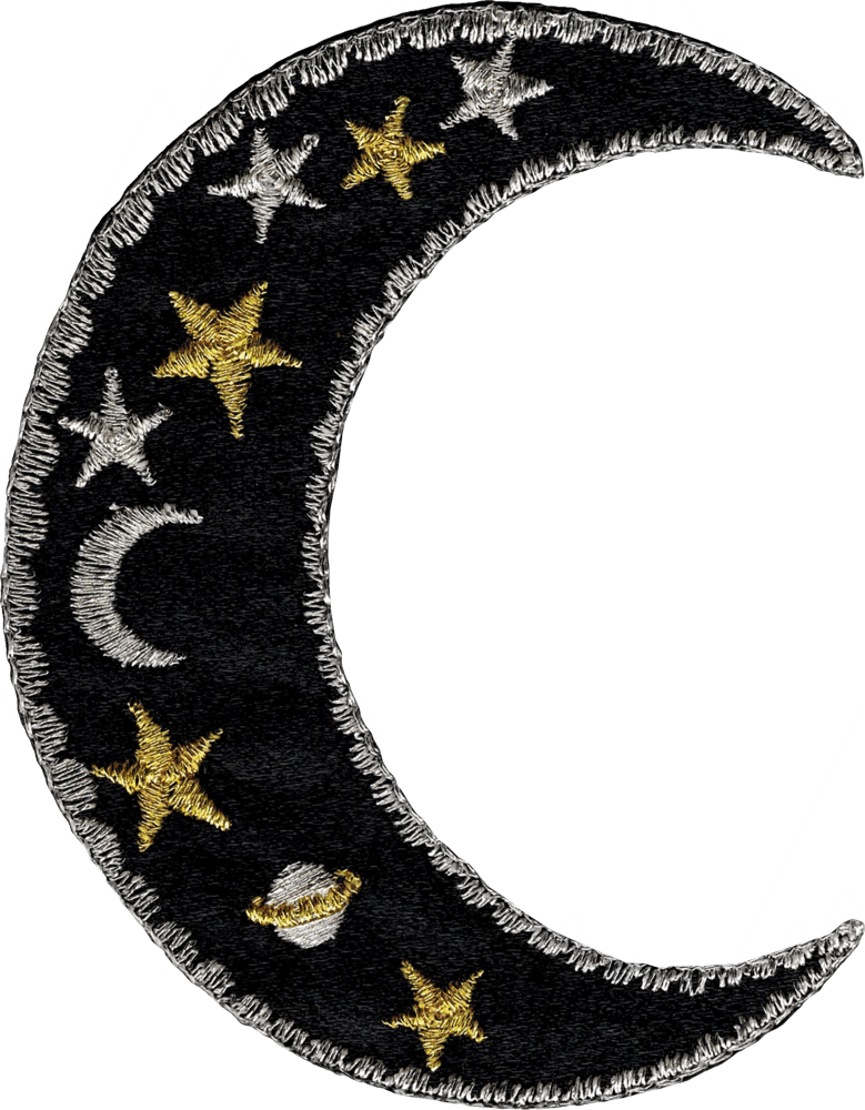Black Celestial Moon with Stars and Planets. 2.5" x 3" Iron On Patch
